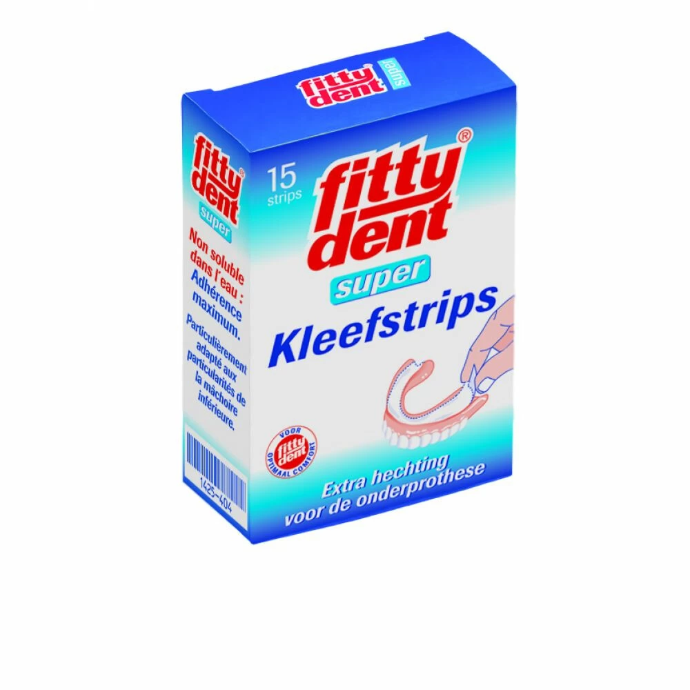 Fittydent Kleefstrips 15 stuksFiffydent Kleefstrips voor de onderkaak bevatten een sterke kleefstof die het mogelijk maakt om een zeer hechte verbinding tussen onderprothese en tandvlees te bewerkstelligen. Fiffydent lost niet op in speeksel, water of elk ander type vloeistof, warm of koud. Hierdoor verliest het dus niet zijn sterke hechting in tegenstelling tot vele andere producten die op de markt aanwezig zijn.