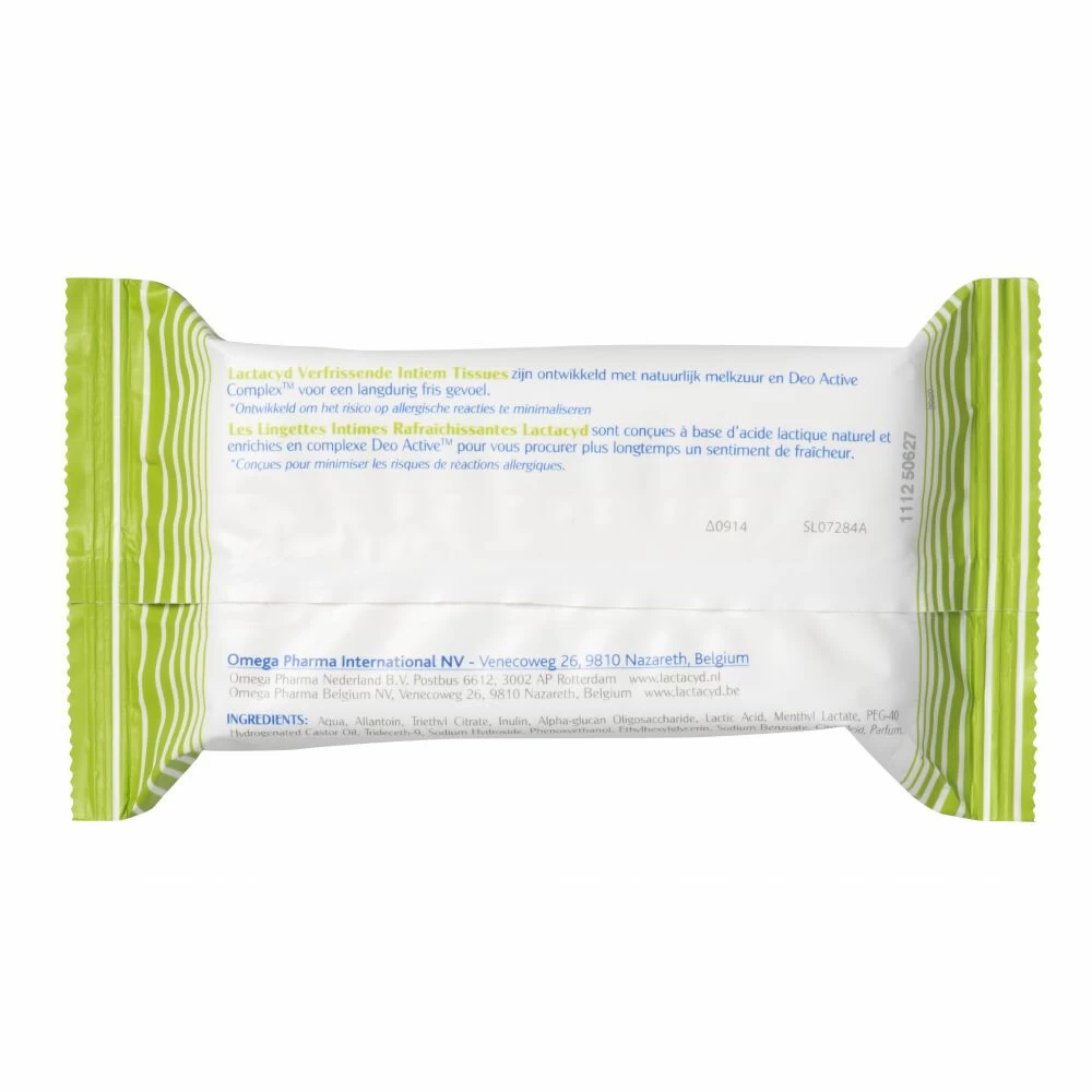Hygienisch en fris voor de vaginaLactacyd Verfrissende Tissues zijn speciaal ontwikkeld voor langdurige, aangename frisheid en helpen beschermen tegen vervelende geurtjes. De tissues zijn verrijkt met een vleugje verfrissende menthol en bevatten natuurlijk melkzuur en reinigen de vagina mild en hygiënisch.Langdurig fris Beschermt tegen geurtjesBevat geen parabenen