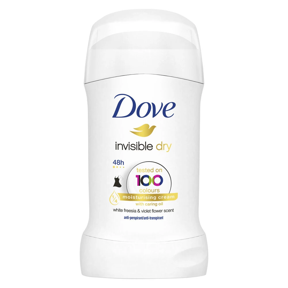 Dove Deodorant Stick Invisible DryMet de Dove Invisible Dry Anti-Transpirant Deodorant Stick zijn witte strepen verleden tijd.Bewezen onzichtbaar op 100 kleuren! Dove Invisible Dry Anti-Transpirant Deodorant Stick beschermt zowel je oksels als je kleding. Deze anti-transpirant is de perfecte oplossing tegen witte strepen en gele vlekken in je kleding. Dove Invisible Dry Anti-Transpirant Deodorant Stick is de eerste deodorant die bewezen onzichtbaar is op zwart, wit en 100 andere kleuren. Het gee
