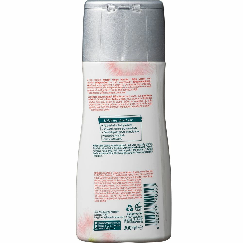 Douchecreme Silky SecretZijdezachte verzorging met Kneipp® crème douche Silky SecretMet natuurlijke melkproteïnen en zijdeboombloemextractVoor een zijdezacht huidgevoelZeepvrijMicroplasticvrije formuleDe luxe, zeepvrije Kneipp crème douche Silky Secret met natuurlijke melkproteïnen en het waardevolle zijdeboombloemextract geeft je een zijdezacht huidgevoel. De plantaardige voedende formulering verbetert het huidgevoel tijdens en na het douchen en zorgt ervoor dat het