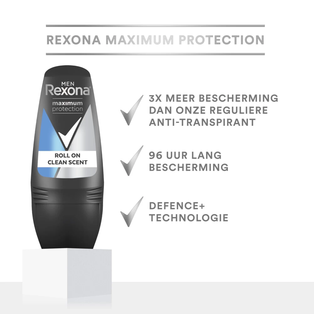 Rexona Men Maximum Protection Clean Scent Deodorant Roller 50 mlRexona Men Maximum Protection Clean Scent Deodorant Roller biedt tot 3x meer bescherming dan onze reguliere anti-transpirant.Blijf fris met Rexona Men Maximum Protection Clean Scent Anti-transpirantDeodorant roller voor mannen met de innovatieve Defence+ TechnologieTot 96 uur bescherming, 3x meer dan onze reguliere anti-transpirantHelpt maximale bescherming te bieden tegen transpiratie en lichaamsgeurDeodorant met een schone, mannel