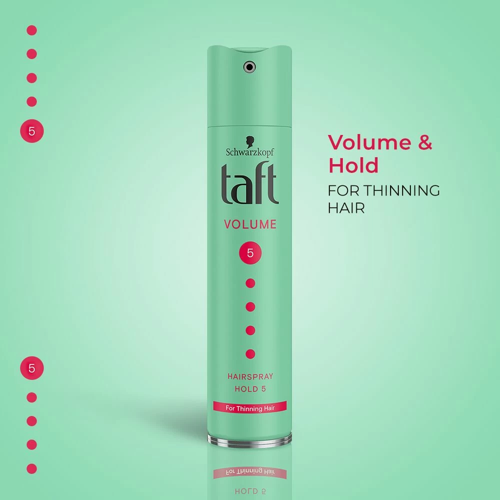 Taft Styling Volume HaarsprayTaft Volume haarspray is speciaal voor (fijn) haar dat extra volume wil. De sterke fixatie houdt het haar goed in model, zodat je er op alle momenten van de dag op kan vertrouwen dat je haar goed zit.Geschikt voor volume en fixatie van (fijn) haar. En voor alle lengtes van kort tot lang haarGeeft sterke fixatie met behoud van de natuurlijke beweging van het haarTot 24u volume & holdLaat geen restjes achter en is gemakkelijk uit te borstelenDe formule van het styl