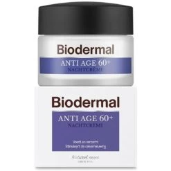 Anti-Age nachtcrème 60+Naarmate de huid ouder wordt ontstaan niet alleen rimpels, het gezicht begint ook haar contouren te verliezen. Daarnaast kan de huid er dof uitzien en onvolmaaktheden vertonen. De huid oogt hierdoor minder vitaal en minder stralend. Een rimpeltje is niet erg, maar je wilt er natuurlijk niet ouder uitzien dan je bent. Biodermal Anti Age 60+ nachtcrème versterkt de eigen kracht van de huid, zorgt voor een optimaal herstel en voeding van de huid. Aanbevolen leeftijd vanaf 6