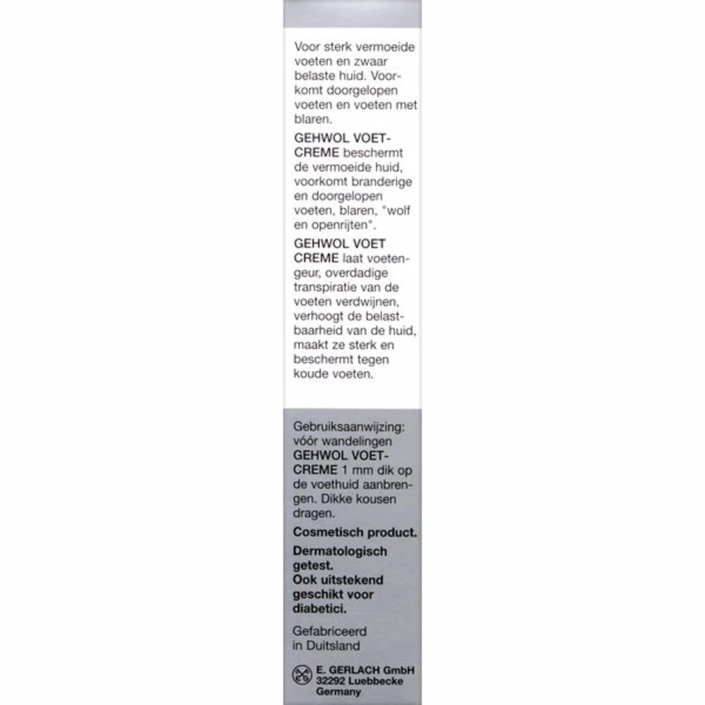 Voorkom blarenEen vanouds beproefd middel ter voorkoming van blaarvorming. De Gehwol Voetcrème versterkt, voedt en verzorgt de huid. Door stimulatie van de bloedcirculatie worden de voeten in conditie gebracht voor grote prestaties en tegelijkertijd wordt het genezingsproces van wonden en blaren bevorderd. Deze rijke en verzorgende crème kan dus ook preventief worden ingezet.Voorkomt blaren en schrijnende plekkenWerkt huidversterkend, is voedzaam en verzorgt de huidZeer geschikt vo