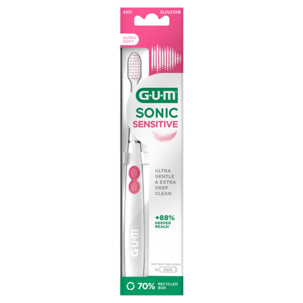 GUM Elektrische Tandenborstel Sonic Daily SensitiveGUM Elektrische Tandenborstel Sonic Sensitive zorgt voor een zachte en extra diepe reiniging. De haren zijn zacht en geschikt voor gevoelige tanden en zacht tandvlees. Het masseert jouw tandvlees dankzij de zachte haren en sonische vibratie. Door zijn kracht en sonische trillingen zorgt de elektrische tandenborstel voor een diepe reiniging. Verwijdert tandplak 88% dieper in moeilijk te bereiken plekken, in verhouding met een gewone tandenborstel