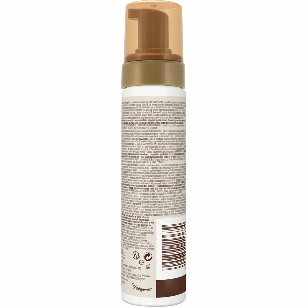 Hawaiian Tropic Sunless Tan Dark Foam Onze zelfbruiner schuim is ontworpen voor je innerlijke en uiterlijke schoonheid. Deze zelfbruinende schuim verzorgt je huid tijdens het bruinen, dankzij de ultralichte hydraterende formule met aloë vera en vitamine E. De tropische geur van dit proefdiervrije product neemt je mee op een reis naar de Hawaïaanse manier van leven voor een betere wereld en een betere versie van jezelf.Extra hydraterende formule met vitamine E en aloë veraBrui