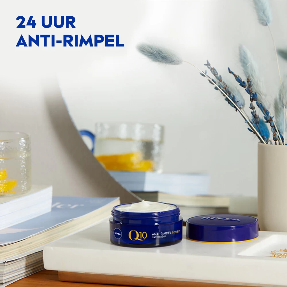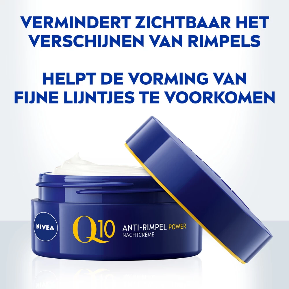 Nivea Anti-Rimpel Nachtcrème Q10plusNivea Q10 Power Anti-Rimpel Nachtcrème bevat Q10 die 100% identiek is aan het huideigen Q10. De formule met co-enzym Q10 met dubbele werking zorgt voor een 24u anti-rimpel werking. De innovatieve formule helpt de huid te regenereren terwijl je slaapt en stimuleert de product van collageen*. Q10 Power Anti-Rimpel Nachtcrème voedt de huid intensief en stimuleert de vernieuwing van de huidcellen*, zorgt voor een zichtbaar stevigere huid en ve