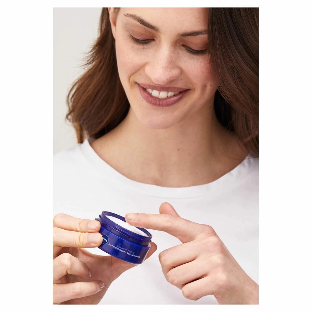 Nivea Essentials Hydraterende NachtcrèmeNivea Hydraterende Nachtcrème hydrateert tot 24 uur intensief, waardoor het helpt het huideigen vochtgehalte in balans te brengen. De formule met Nivea Hydraterend Care Complex, Vitamine E, Provitamine B5 en Natuurlijk waterlelie-extract verfrist en vult de huid aan met snelle hydratatie. De Nachtcrème bevordert de natuurlijke regeneratie van de huid gedurende de nacht. Nivea Hydraterende Nachtcrème is geschikt voor de normale h