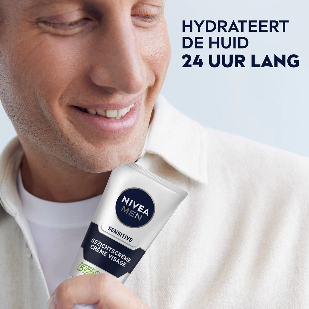 Nivea Men Sensitive GezichtscrèmeNivea men sensitive gezichtscrème 75ml voedt de huid intensief zonder restjes achter te laten. Het verzacht de huid en helpt huidirritaties te voorkomen dankzij de combinatie van kamille en hamamelis. De lichte crème formule met 0% alcohol geeft geen branderig gevoel en trekt snel in. Geeft de gevoelige huid een comfortabel en relaxed gevoel en laat de huid er gezond uitzien.De extra milde formule bevat licorine-extracten, kamille en uva/uvb-