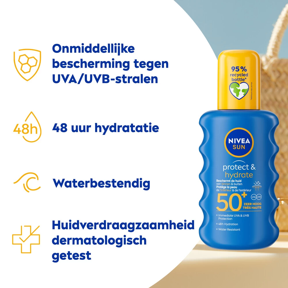 Nivea Sun Protect & Hydrate Hydraterende Zonnespray SPF 50Nivea Sun Protect & Hydrate Spray SPF50+ 200ml beschermt de gezonde huid van binnen & buiten. Het biedt onmiddellijke UVA/UVB-bescherming en ondersteunt de huidbescherming van binnenuit met anti-oxidatieve vitamine E. De huid blijft 48 uur lang gehydrateerd. De waterbestendige formule is voor 88% biologisch afbreekbaar* en respecteert de oceaan door vrij te zijn van UV-filters Octinoxate, Oxybenzone en Octocrylene. De verpakki