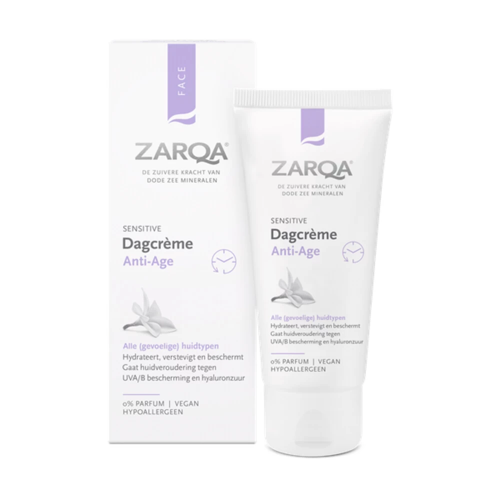 Zarqa Dagcreme Anti-Age 50 mlDeze Zarqa Dagcrème Anti-Age verstevigt en beschermt de huid en vertraagt rimpelvorming. Het anti-age complex met Jojoba-olie beschermt op een natuurlijke wijze tegen huidveroudering en schadelijke invloeden van buitenaf, zoals UV straling en luchtvervuiling.Hyaluronzuur, provitamine A en E zorgen voor een elastische en goed gehydrateerde huid. Het verlaagt de kans op het ontstaan van pigmentvlekken en beschermt het DNA.Kenmerken Zarqa Dagcreme Anti-AgeB