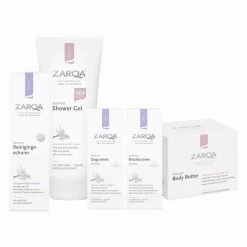 Zarqa Hydra PakketHet Zarqa Hydra Pakket bestaat uit een douchegel, dagcrème, nachtcrème, body butter en reinigingsschuim. Zarqa Douchegel heeft een reinigende, verzorgende en verkoelende werking op de huid. Geschikt voor het hele gezin en ieder huidtype. Deze douchegel bevat geen parfum, siliconen of kleurstoffen en is daardoor ook geschikt voor mensen met een (zeer) gevoelige huid. De natuurlijke menthol geeft de Zarqa douchegel, zonder parfum, toch een frisse geur.De