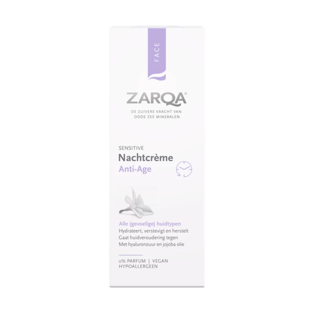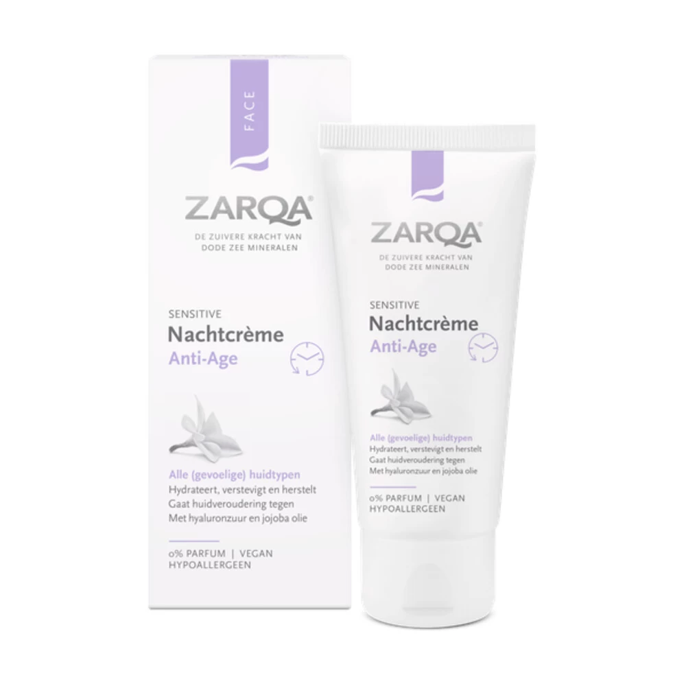Zarqa Nachtcrème Anti-Age 50 mlDeze Zarqa Nachtcrème Anti-Age is een voedende en herstellende nachtcrème. Het verstevigt de huid en vertraagt rimpelvorming. Het stimuleert huidvernieuwing en collageenaanmaak en versterkt de huidbarrière.Het anti-age complex met Jojoba-olie beschermt op een natuurlijke wijze tegen huidveroudering en schadelijke invloeden van buitenaf, zoals luchtvervuiling.Hyaluronzuur, provitamine A zorgen voor een elastische en goed gehydrateerde hui